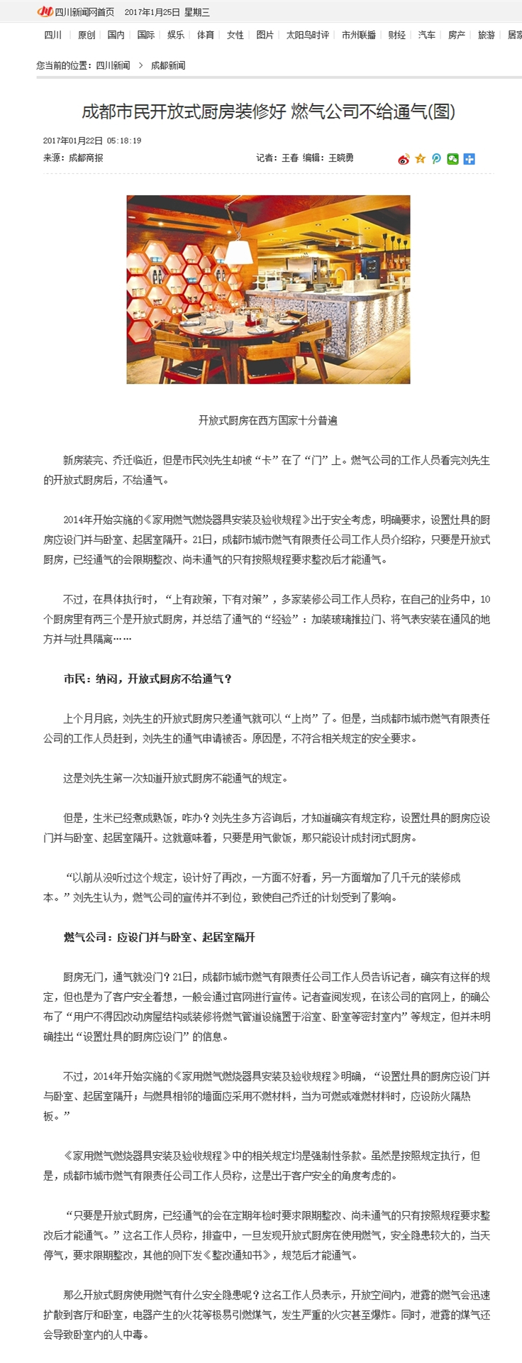 答:(1)開(kāi)發(fā)商委托燃?xì)夤緦?shí)施民用燃?xì)夤こ虝r(shí),提供您家住宅的建筑資料中,廚房是有獨(dú)立的功能空間,您家里的燃?xì)庠O(shè)施是根據(jù)您家的廚房環(huán)境設(shè)計(jì)的。根據(jù)國(guó)家相關(guān)規(guī)范,燃具應(yīng)安裝在通風(fēng)良好,有給排氣條件的廚房或非居住房間內(nèi),您們擅自將廚房裝修成開(kāi)放式或取掉廚房的門(mén),使燃具安裝在居住房間內(nèi),違背了相關(guān)國(guó)家規(guī)范的要求,不符合安全用氣條件,因此您家的開(kāi)放式廚房不能通氣。